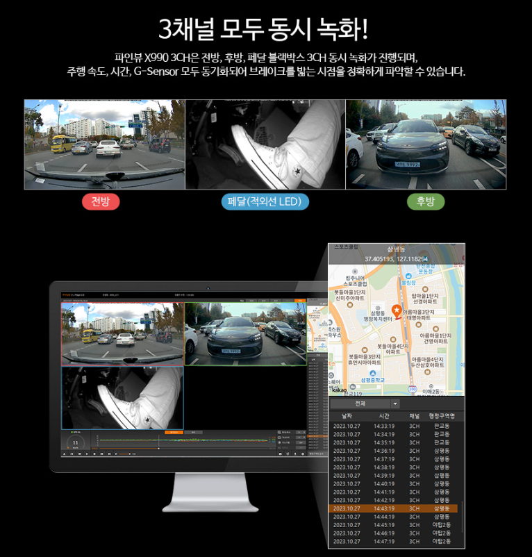 '파인뷰 X990 3CH'는 급발진 의심 사고에 대비한 제품으로, 적외선 IR 페달 카메라로 어두운 차 밑 공간도 선명하게 촬영 가능합니다.